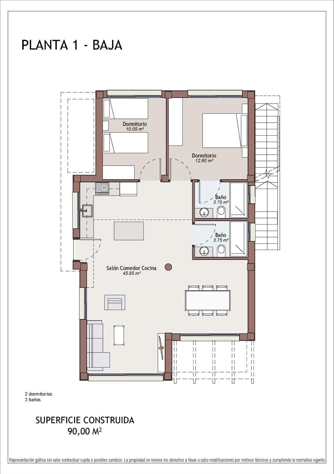 Residencial de obra nueva de chalets independientes a elegir entre dos modelos: de doble altura, con 3 dormitorios y tres baños y de 2/3 dormitorios con dos baños, todo en una planta.