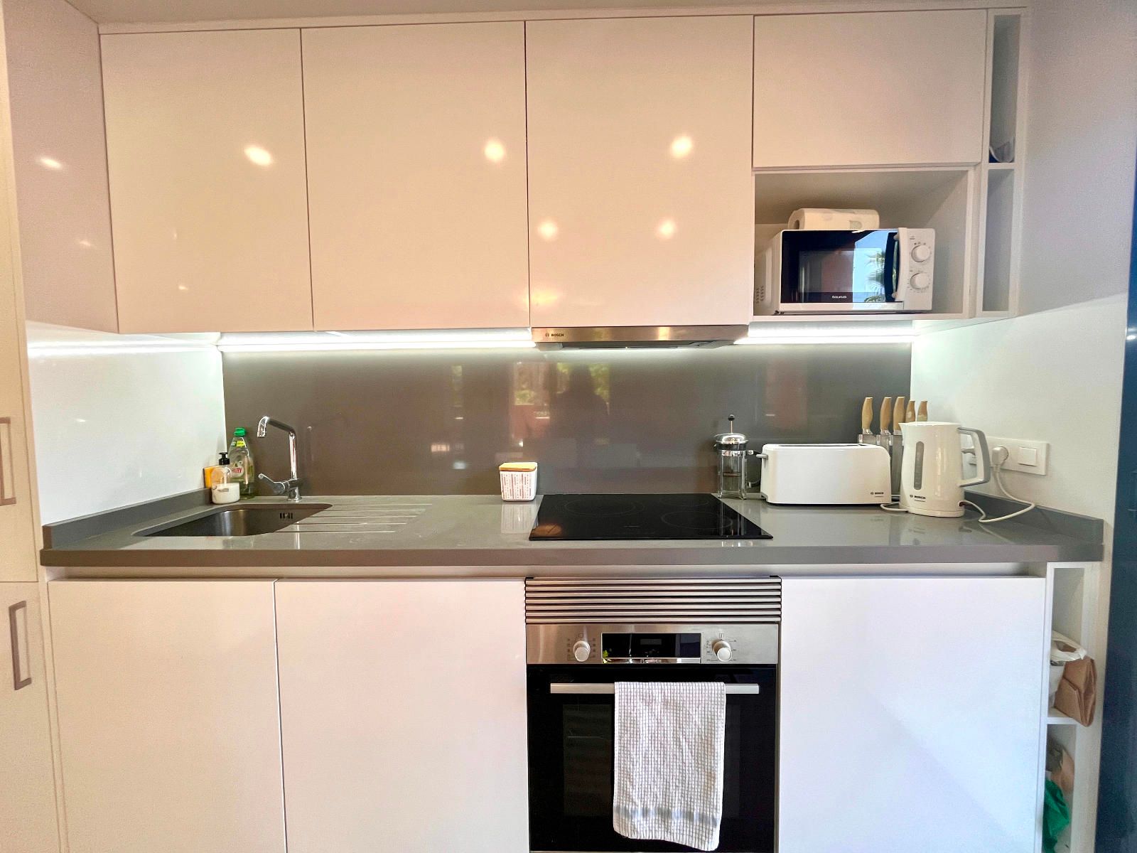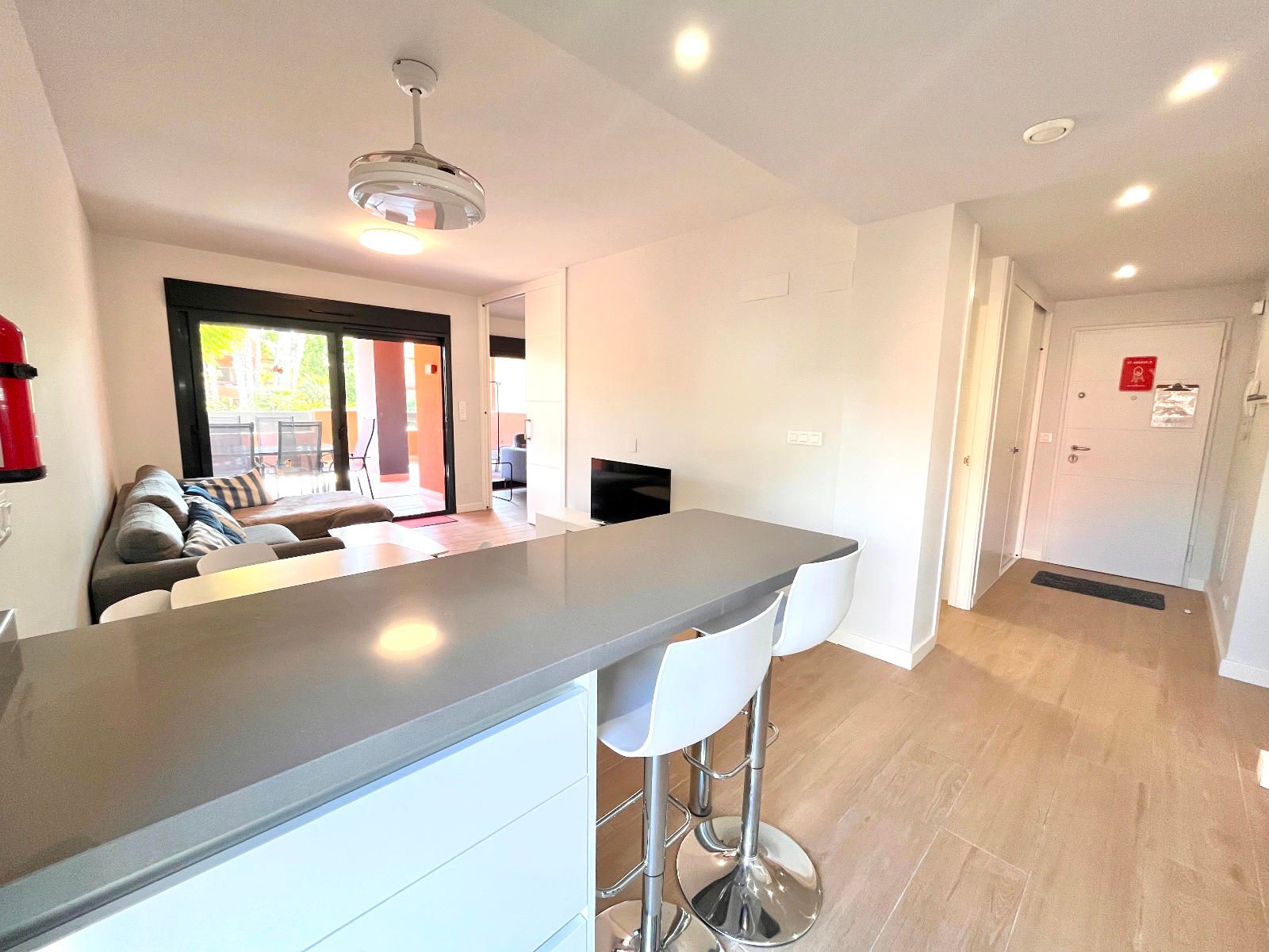 El apartamento ofrece un salón con cocina de estilo abierto, dormitorio principal con baño en suite, lavadero y una amplia terraza privada donde podrás relajarte y disfrutar de las noches de verano.