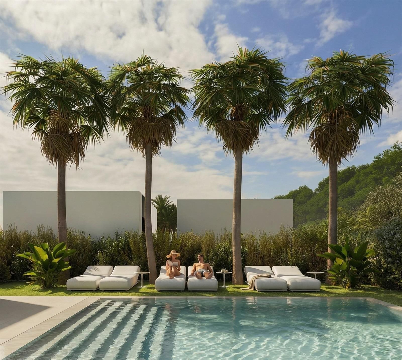 Esta separación garantiza la privacidad, la tranquilidad y una experiencia de vida sin coches dentro de la zona residencial. Villas modernas con jardines privados Las villas se distribuyen en una sola planta y ofrecen uno o dos dormitorios con un cuarto de baño.