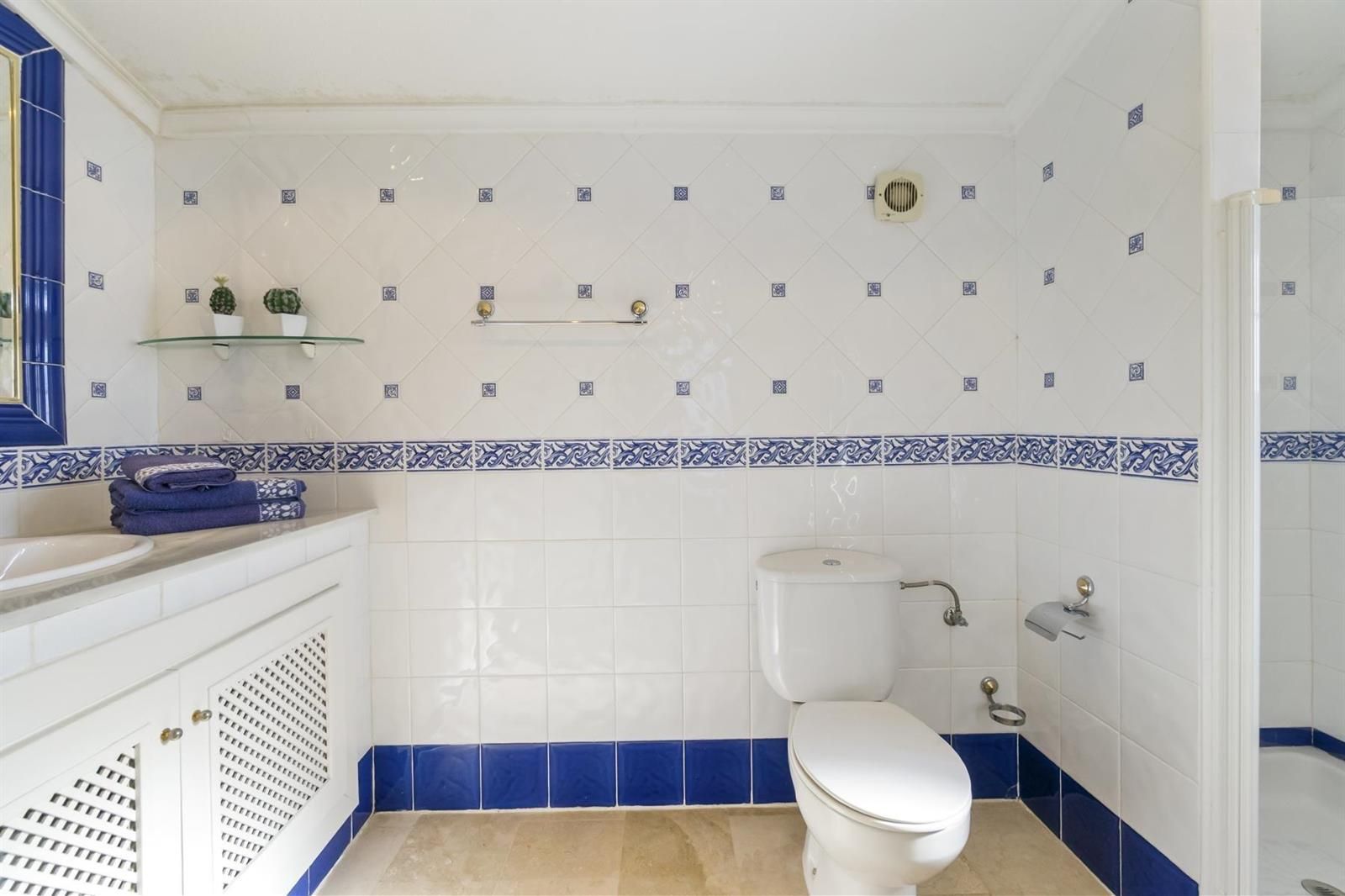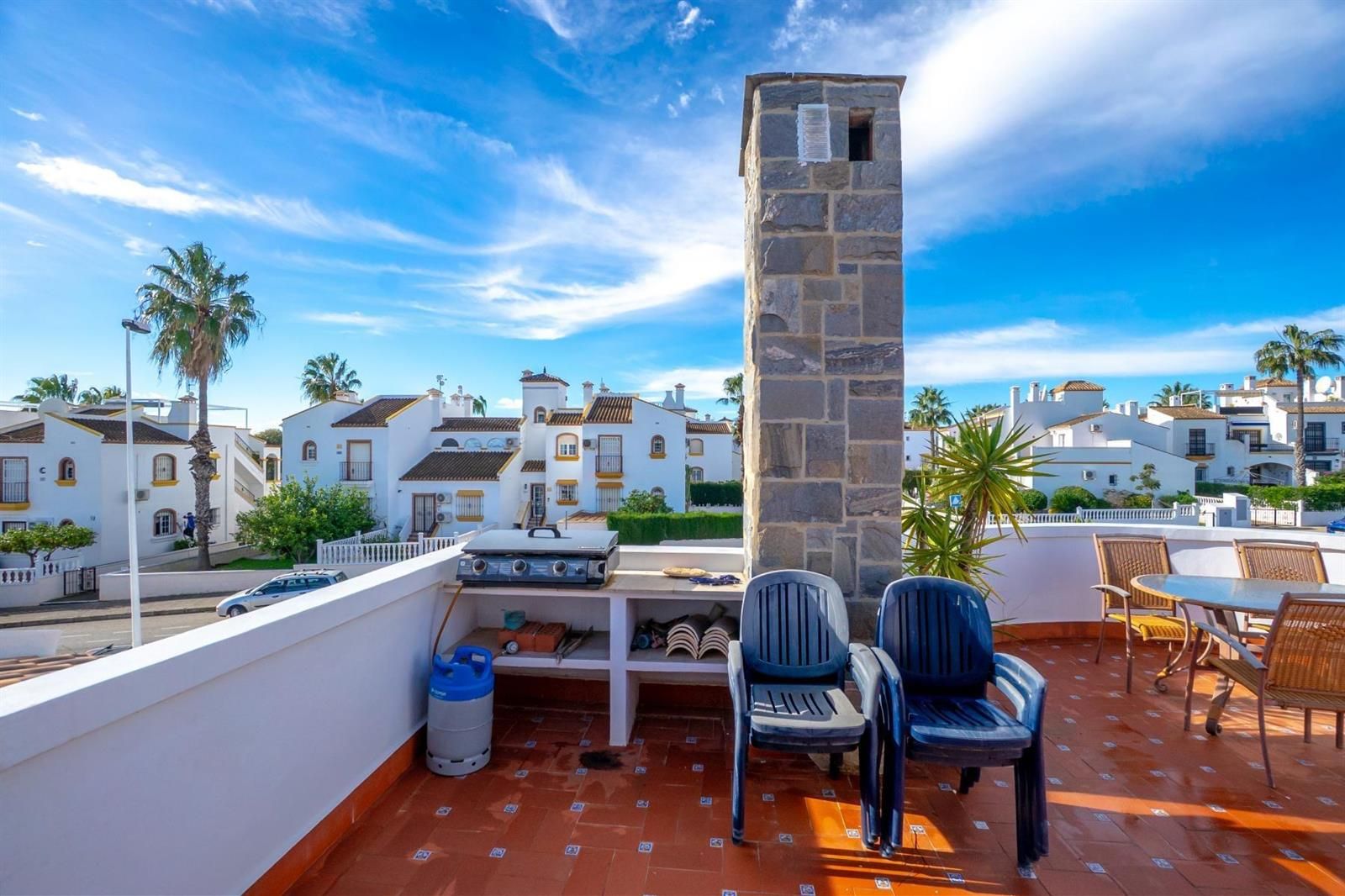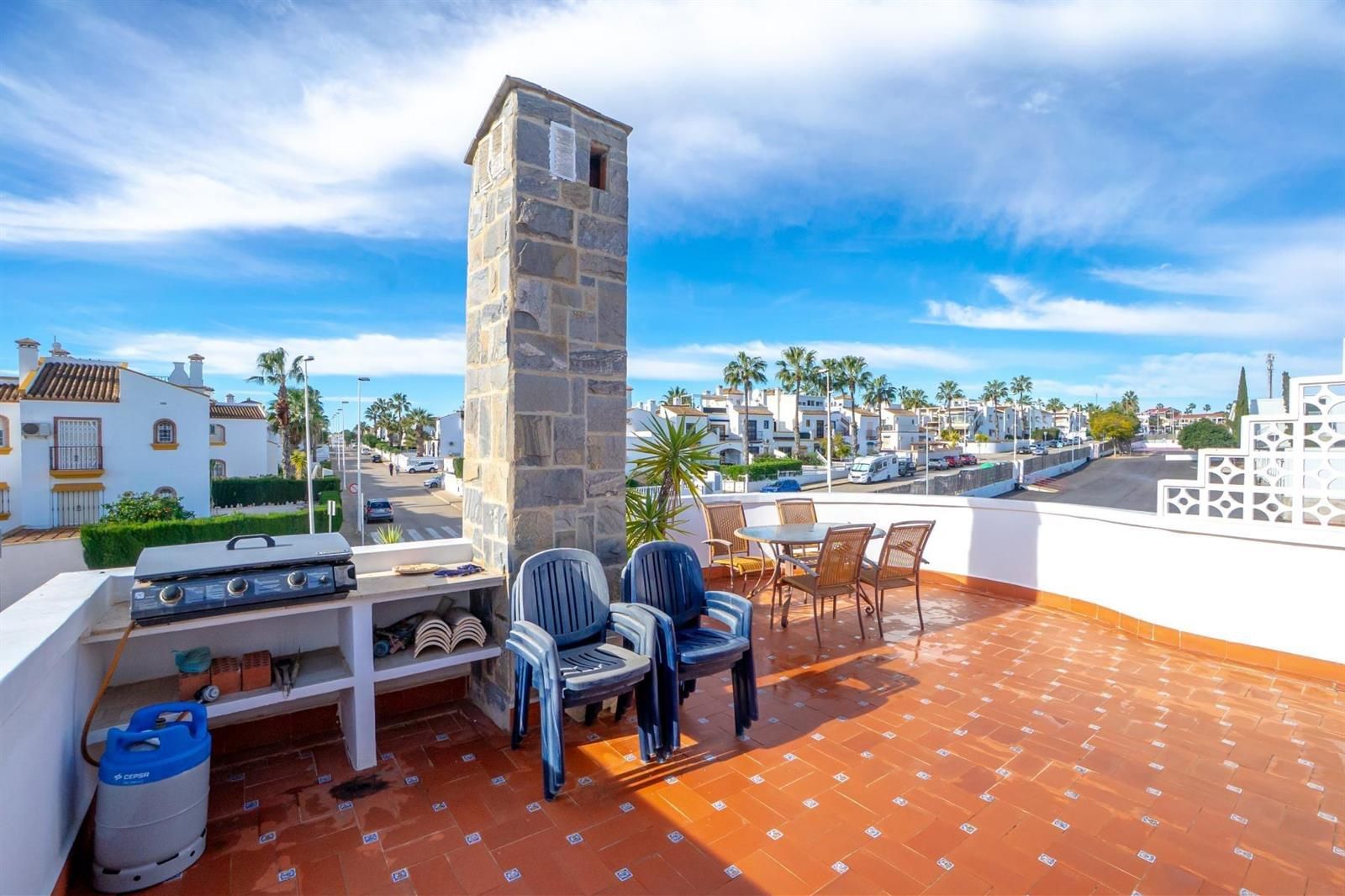 La planta primera alberga dos dormitorios adicionales, uno de ellos con baño en suite y acceso directo a una magnífica terraza/solárium de aproximadamente 32 m², que cuenta con un práctico trastero y está acondicionada para disfrutar de barbacoas y momentos al aire libre.