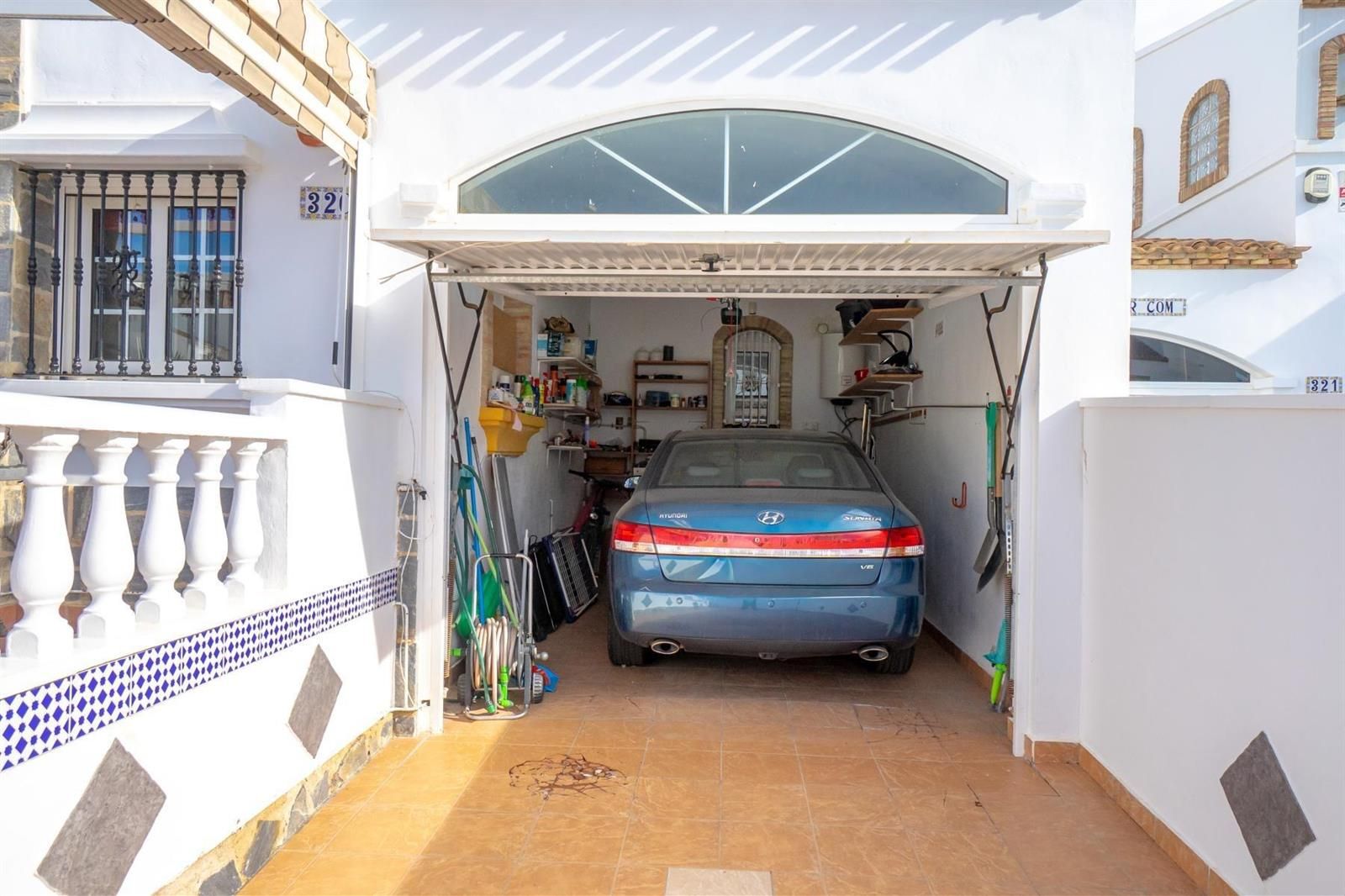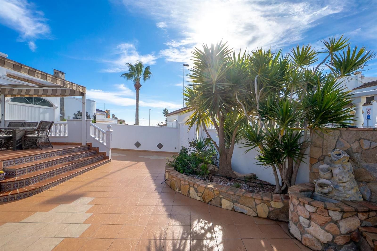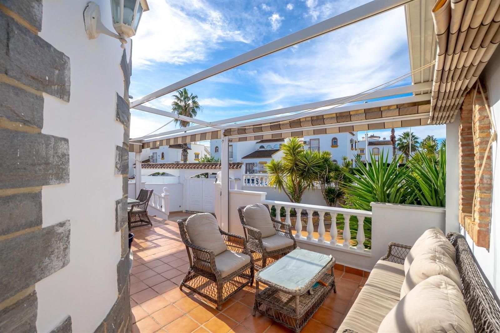 En el exterior, un jardín embaldosado da la bienvenida a la vivienda, junto a una amplia terraza con toldos, perfecta para reuniones con familiares y amigos y para disfrutar del aire libre durante todo el año.