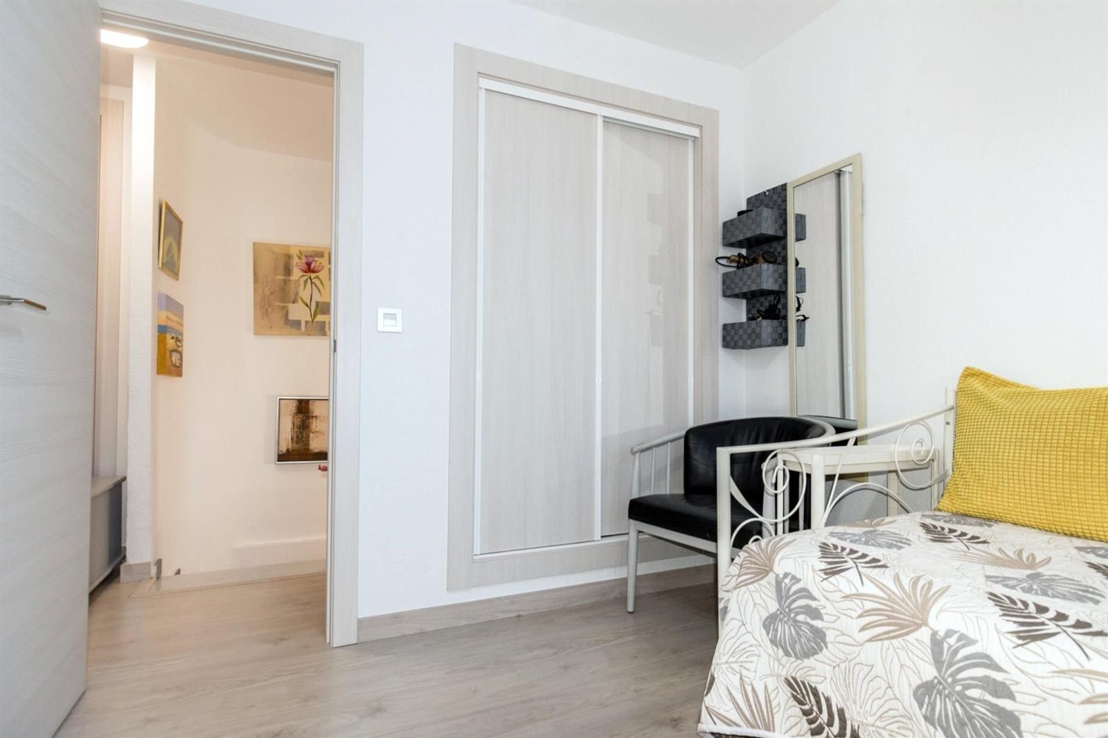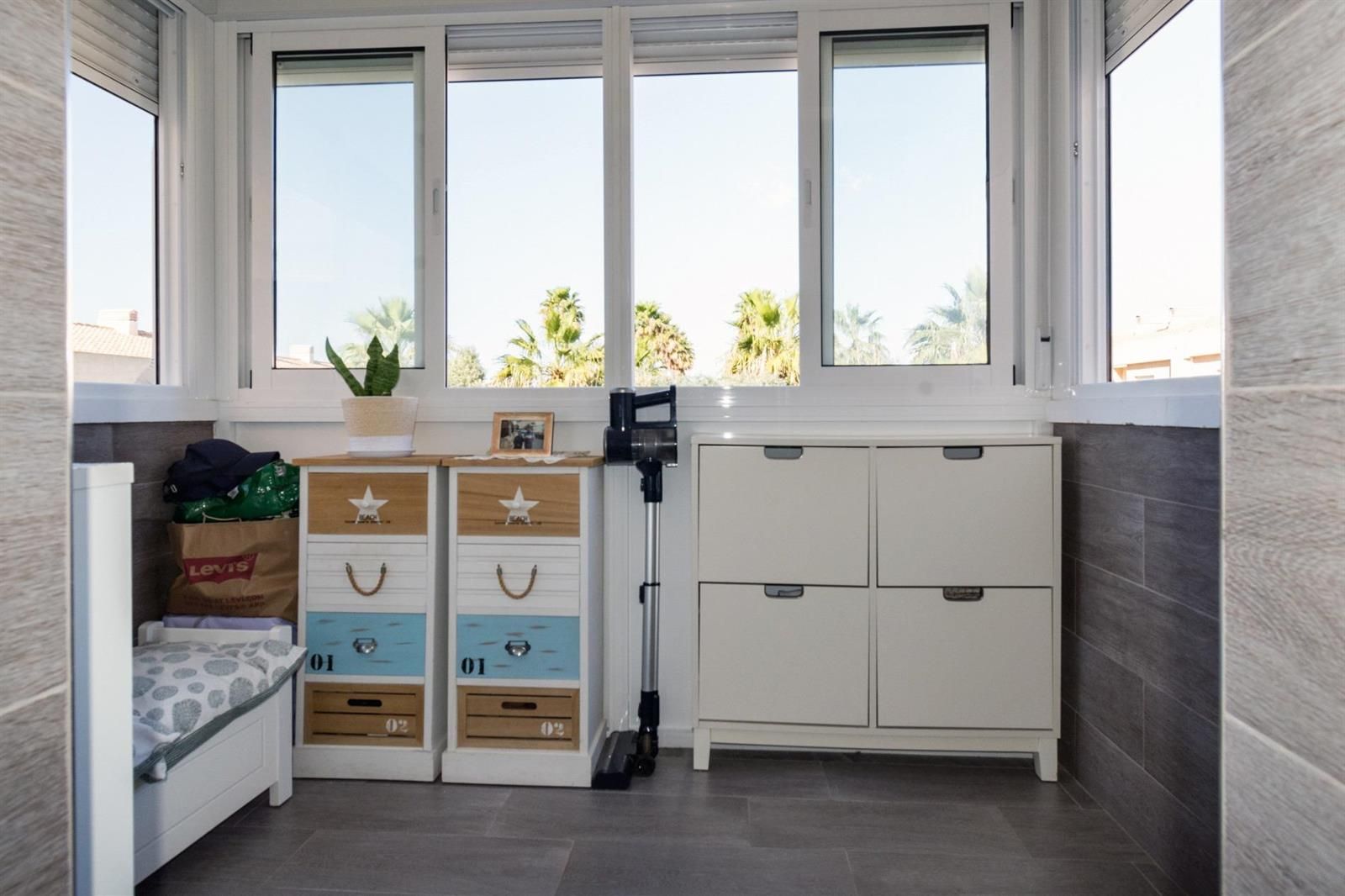 Desde uno de los dormitorios se accede a una terraza acristalada con vistas a la piscina comunitaria y a las zonas comunes.