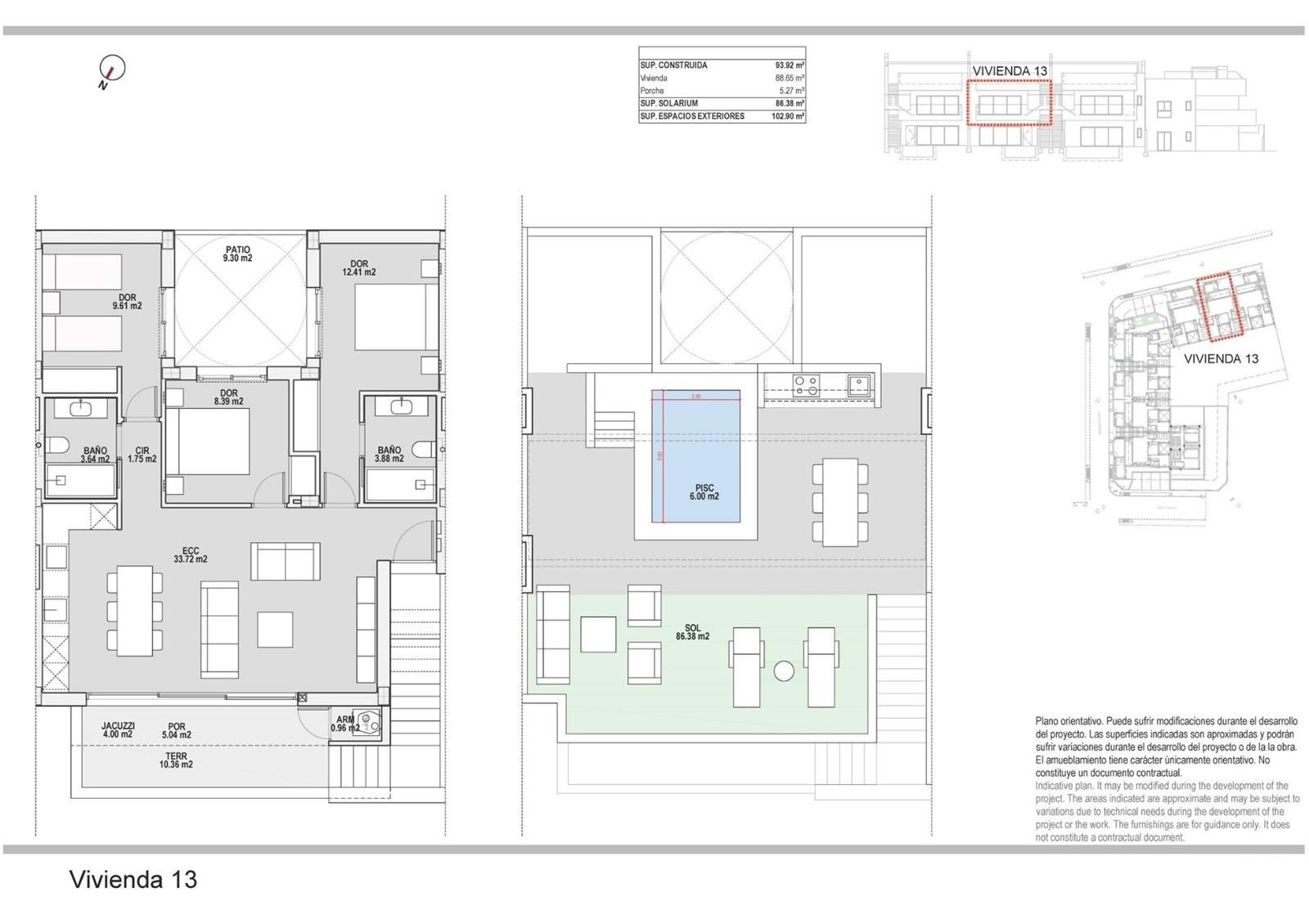 Pilar de la Horadada es conocida por su ambiente acogedor, su encanto tradicional español y su animada calle principal llena de cafeterías, boutiques y encantadoras plazas. Bungalows modernos con espacios exteriores privados Las viviendas han sido diseñadas para ofrecer interiores luminosos y distribuciones funcionales, perfectas tanto para vivir de forma permanente como para pasar las vacaciones. Los bungalows de la planta baja cuentan con jardín privado y piscina privada, creando el entorno perfecto para disfrutar de la vida al aire libre, tomar el sol o recibir a familiares y amigos. Los bungalows de la planta superior incluyen una amplia terraza y un solárium privado en la azotea.