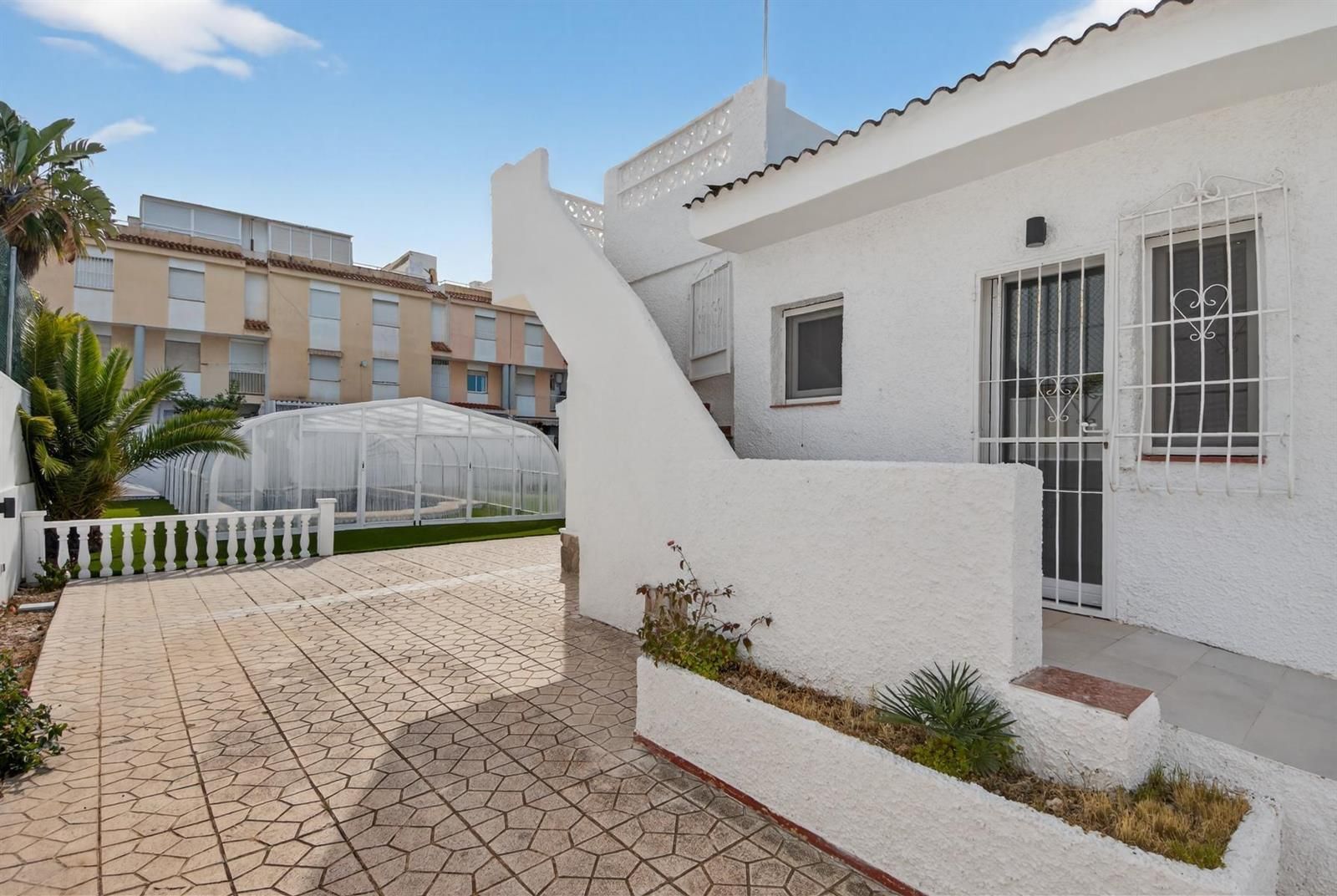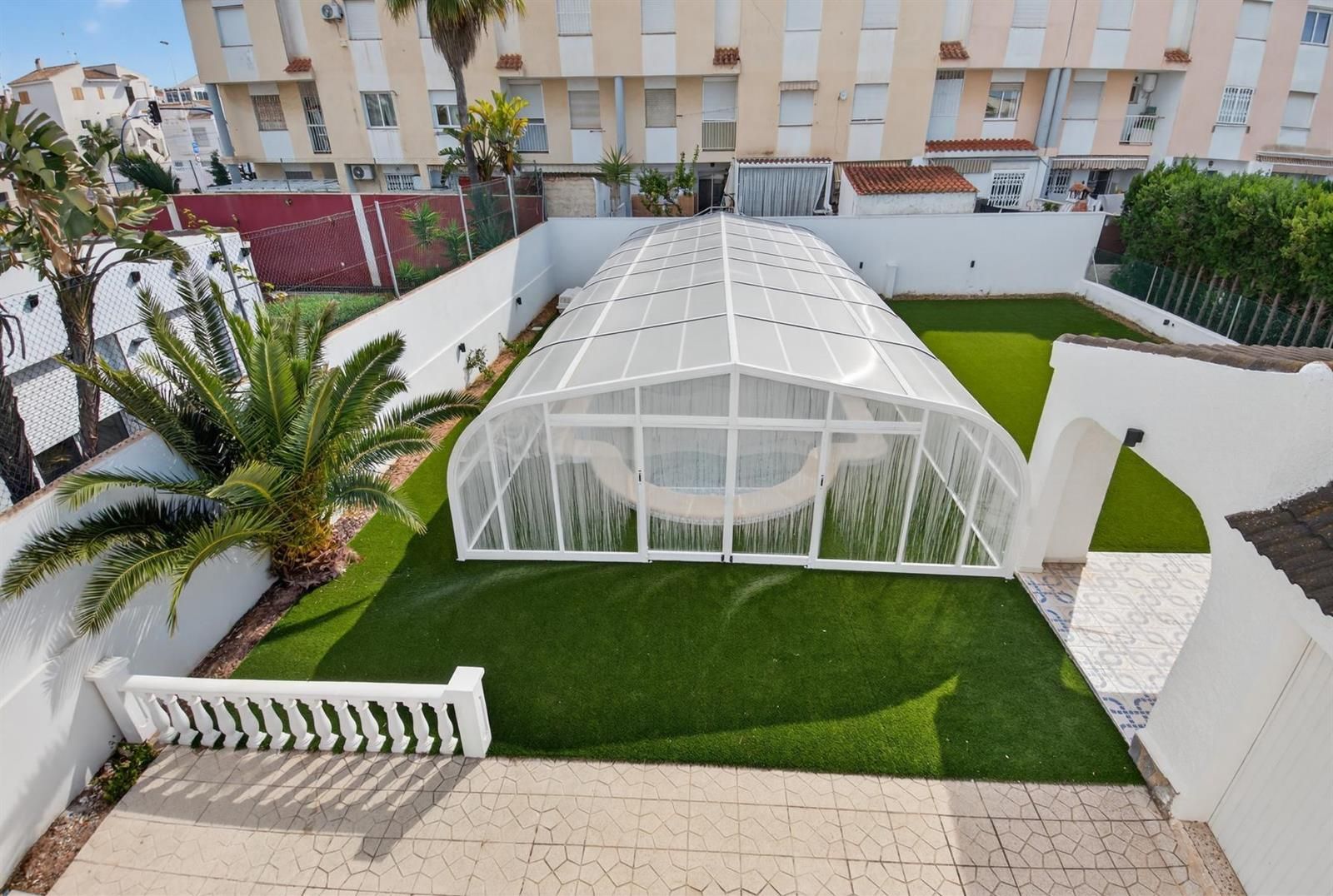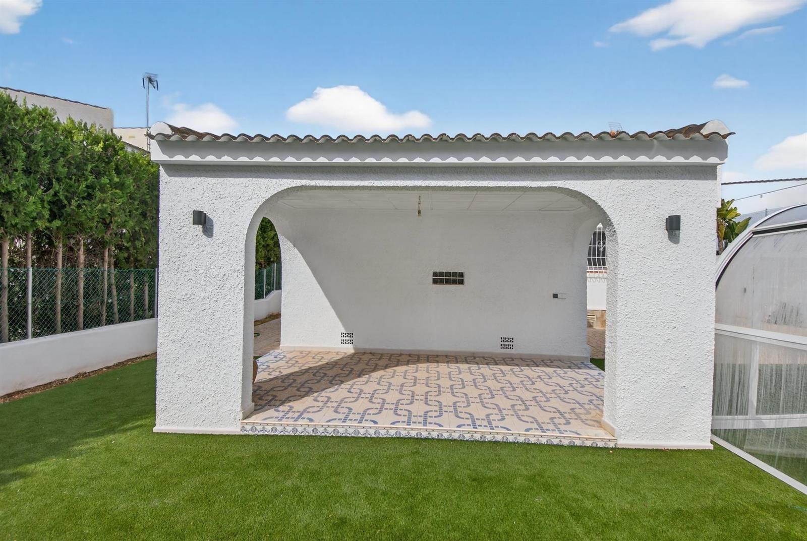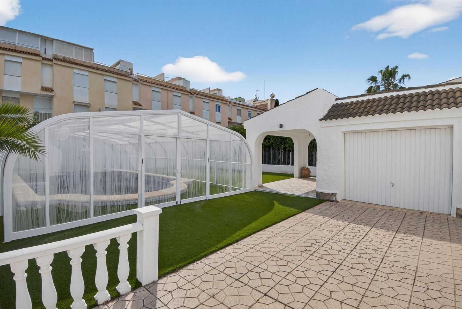 En el exterior, la propiedad está diseñada para disfrutar sin complicaciones, con piscina privada cubierta, zonas de jardín con césped artificial, áreas embaldosadas, porche cubierto ideal para comidas al aire libre y garaje cerrado.