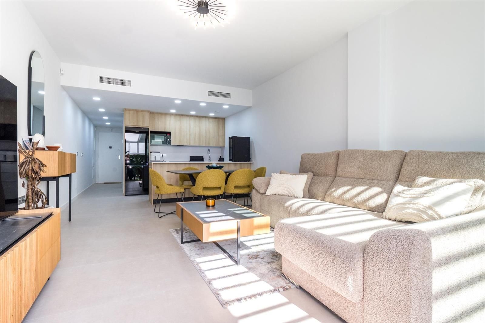 Salón amplio con cocina integrada, tres dormitorios dobles (uno con terraza propia) y dos baños completos.