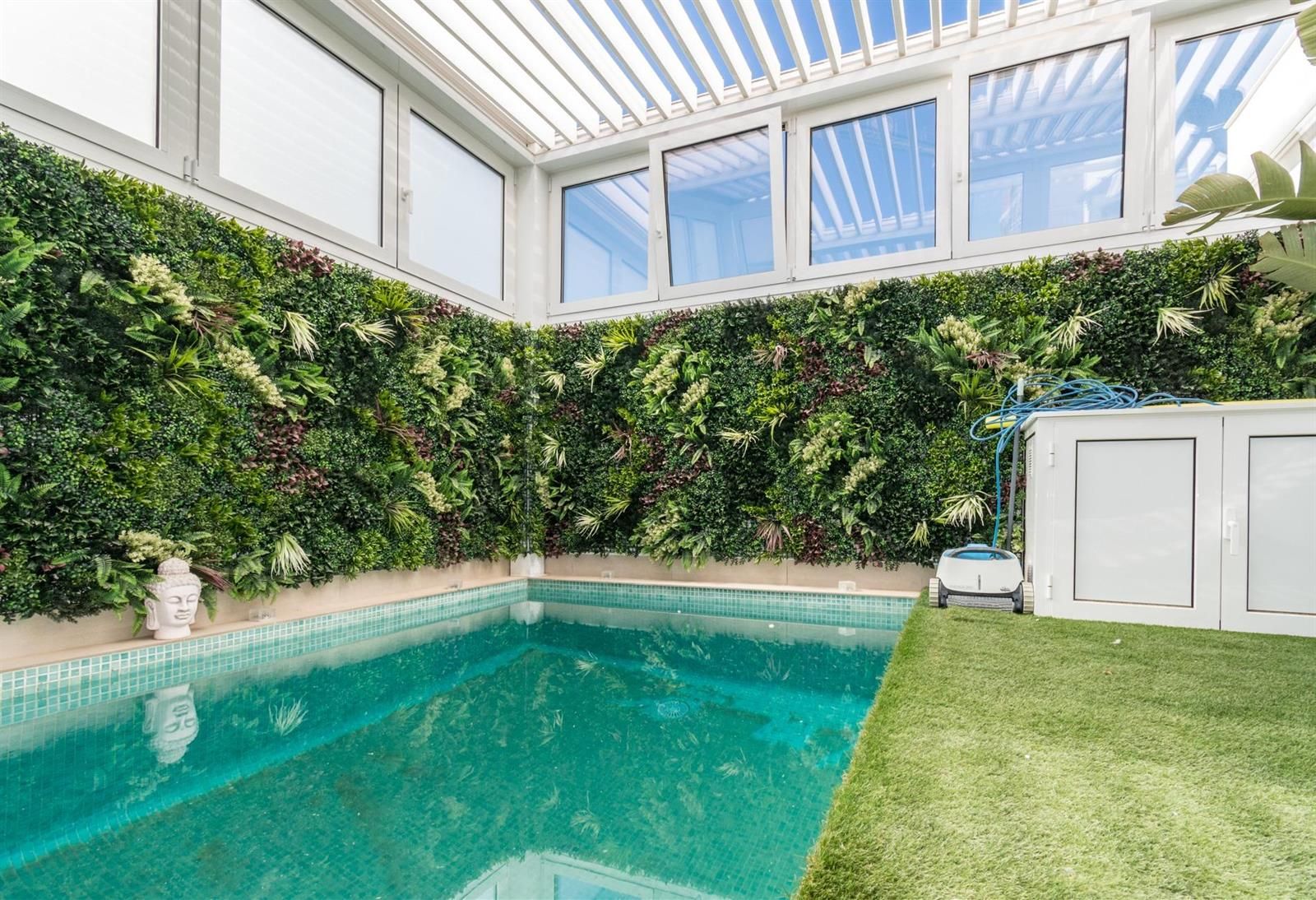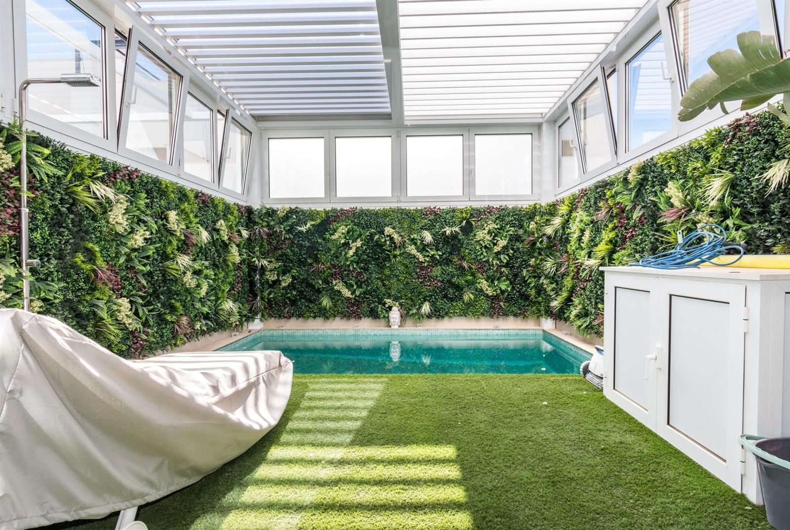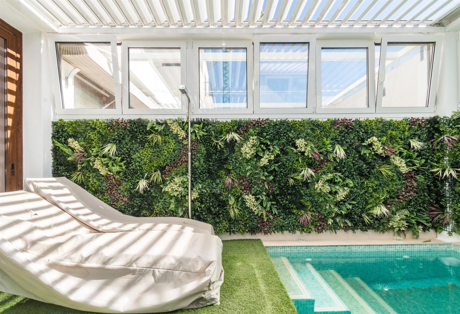 Jardín trasero orientado al sureste con pérgola bioclimática, piscina privada y una zona muy cuidada alrededor.