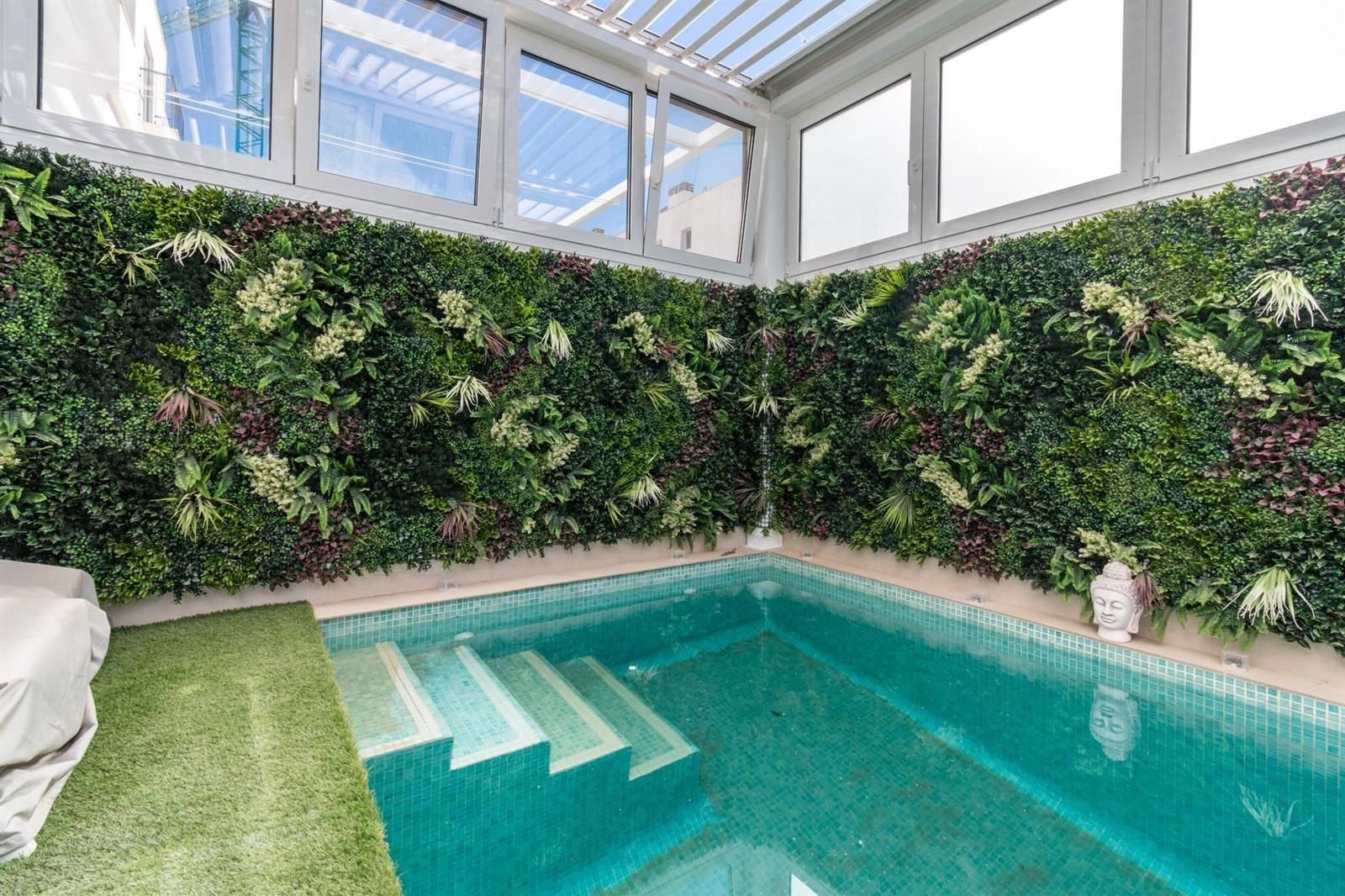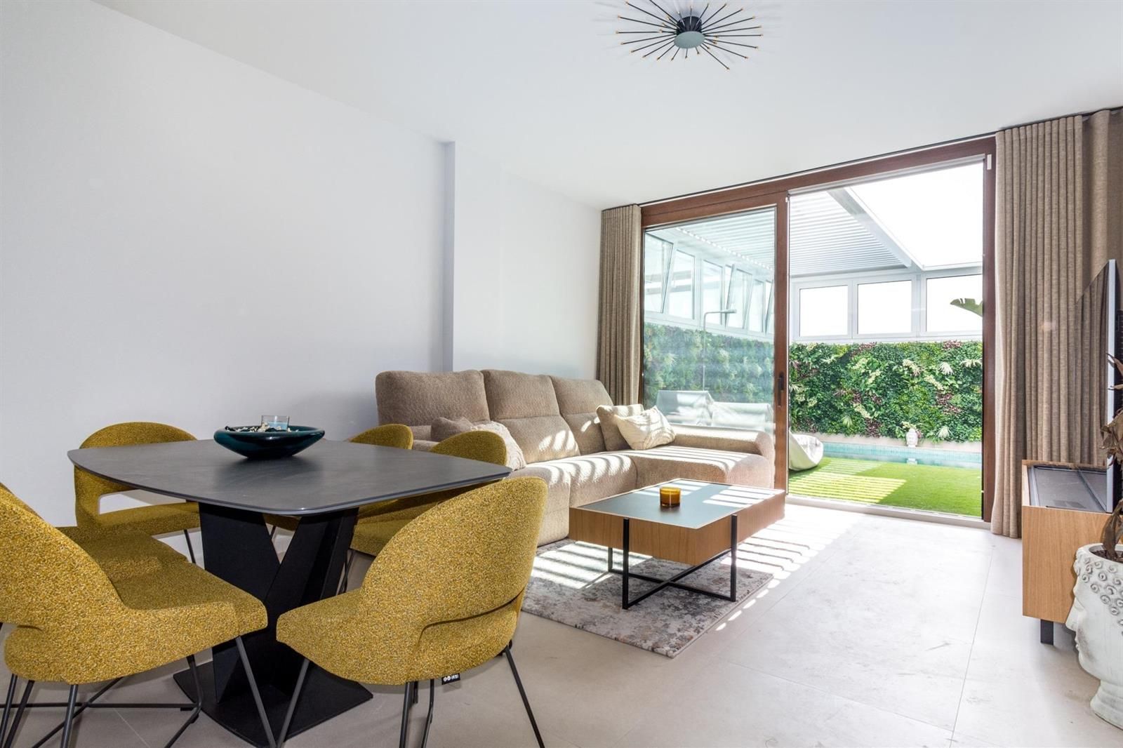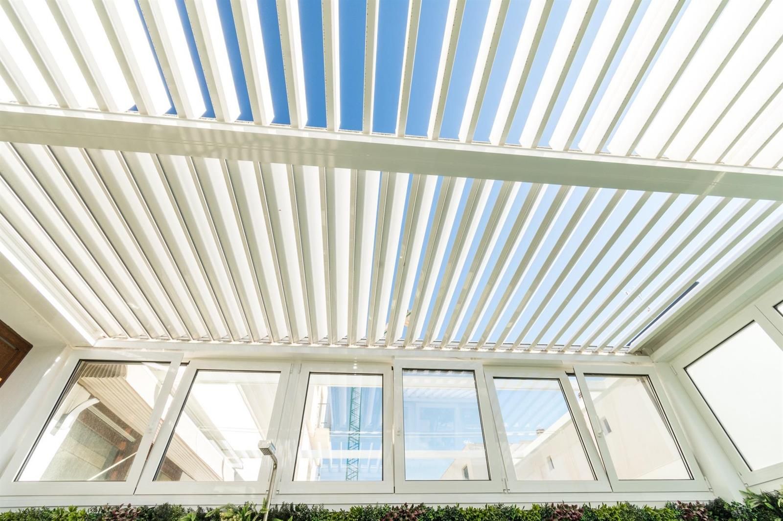 Jardín trasero orientado al sureste con pérgola bioclimática, piscina privada y una zona muy cuidada alrededor.